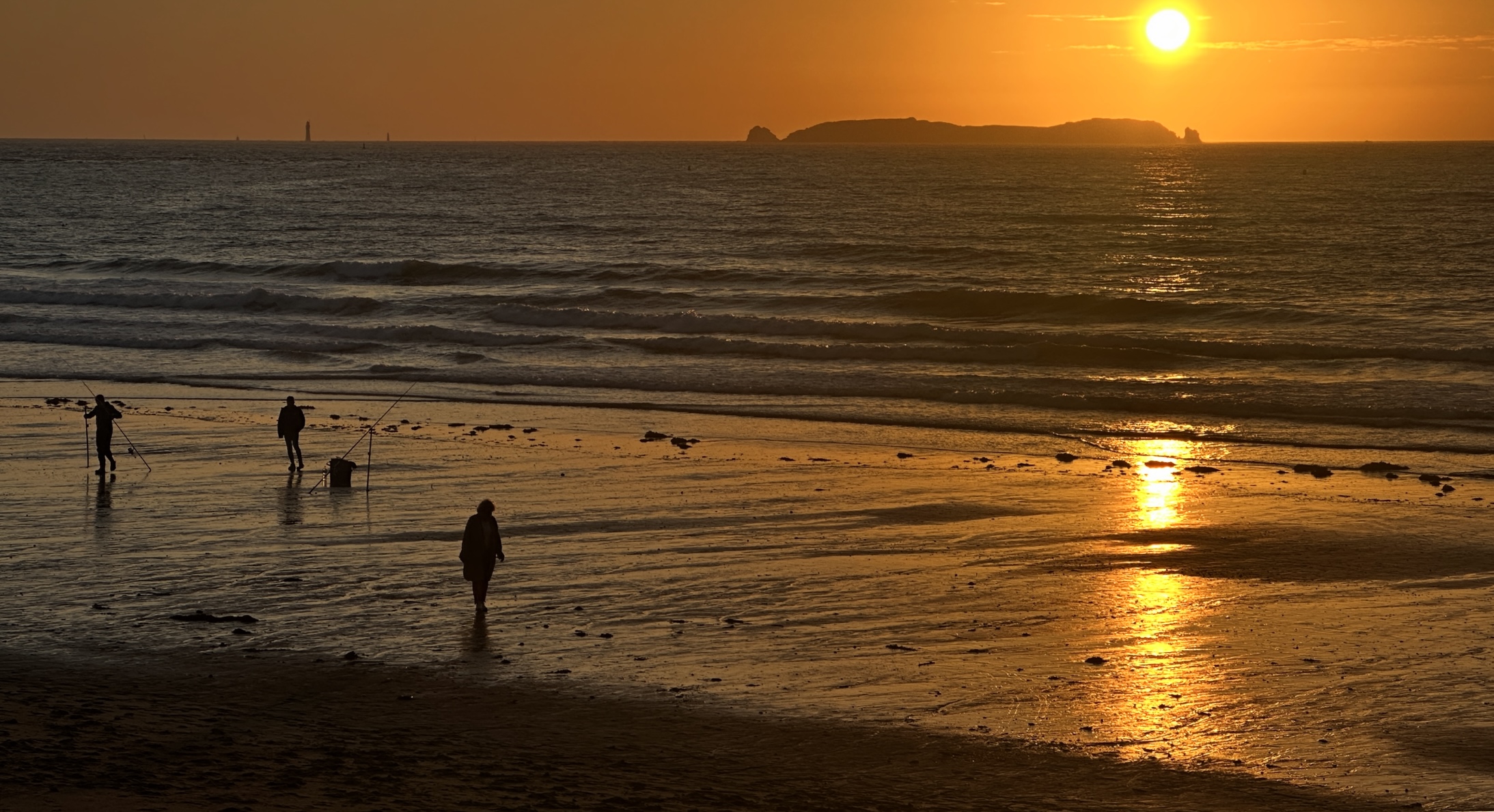 Sonnenuntergang über dem Ärmelkanal bei St-Malo, Fischer im Gegenlicht haben ihre Ruten ausgeworfen. Eine Person spaziert dem Strand entlang.