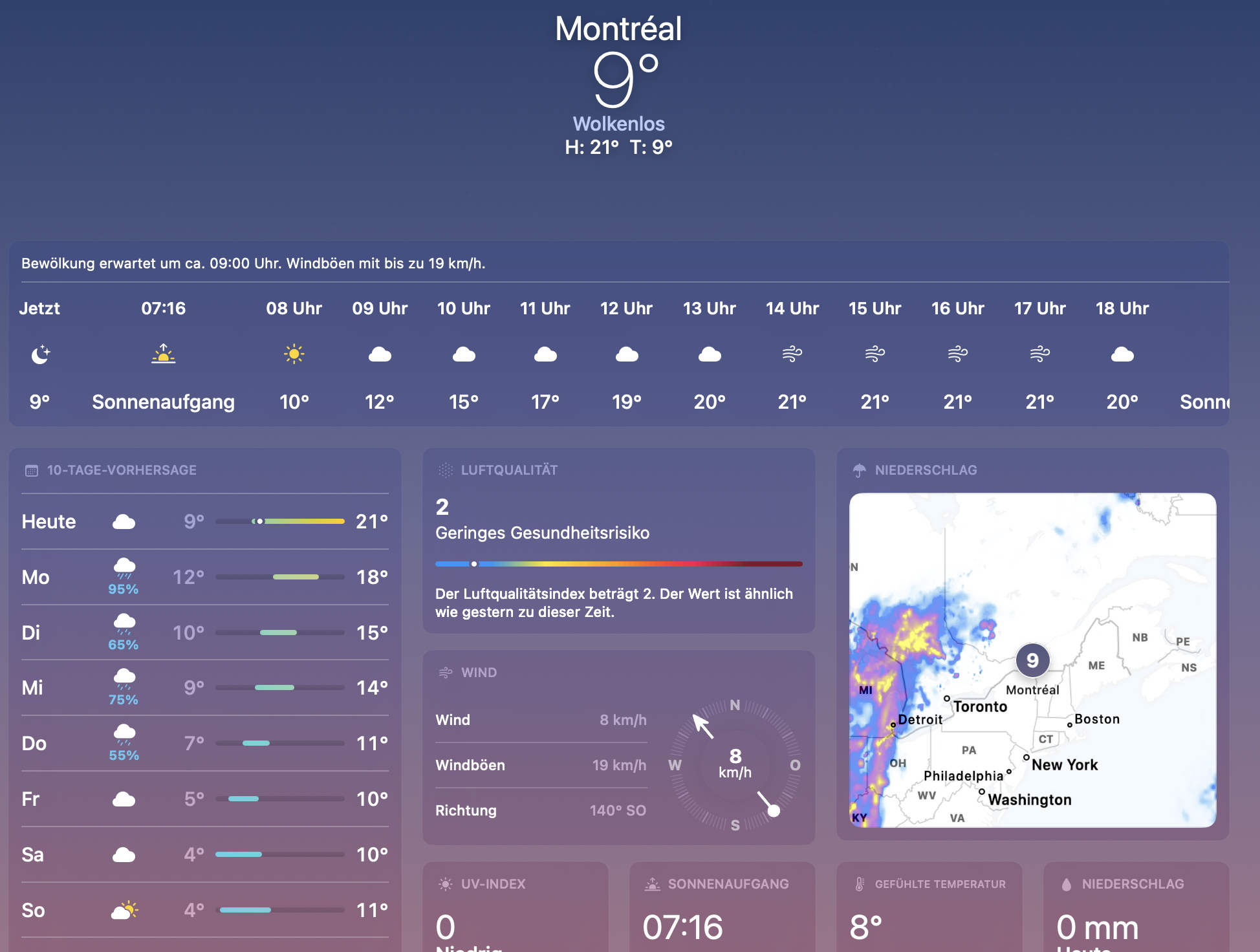 Ich schob meine Pläne hin und her und die Ferien noch eine Woche mehr in den Herbst hinein, bis ich mich endlich ziemlich unentschlossen doch noch entschlossen hatte. Ich nahm ein paar dieser angesparten Meilen und kaufte damit für ungefähr den Drittel eines 2. Klasse GA ein Gratis-Ticket (ahahaha) nach Montréal.