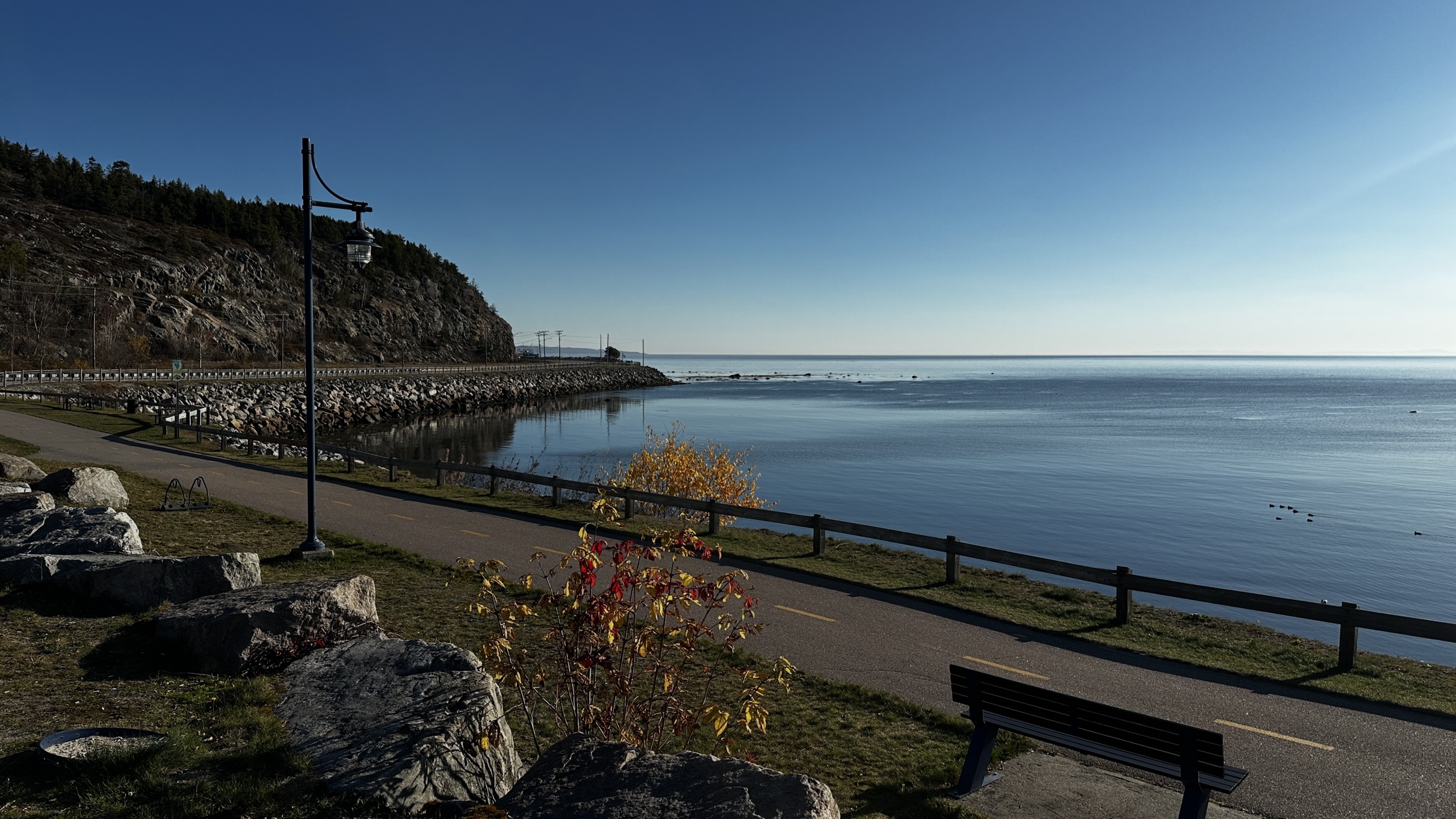 Ich belud den eiskalten Wagen und füllte ebensolches Wasser von der grossen Literflasche in die kleinen Fläschchen um, welche ich jeweils unterwegs im Wagen habe. Danach schaltete ich die Sitz- und Lenkradheizung ein und schnell wurde es angenehm. Der Weg führte mich zur Fährstation, wobei ich noch kurz an der Bucht in einen Parkplatz hinaus fuhr, um das tolle Wetter zu bewundern. Weiter oben hätte ich noch einen alte Dampflok als Vordergrund gehabt, aber da gab es keinen Ort zum Anhalten.