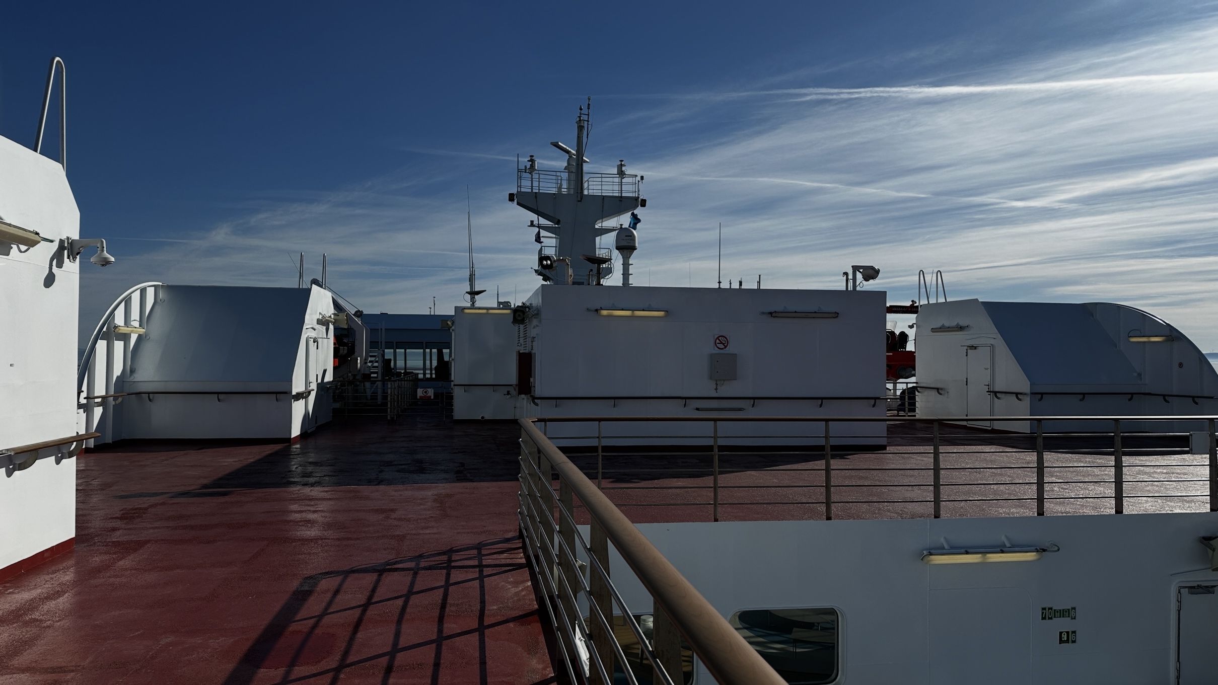 Später wagte ich mich auf's Oberdeck und in die blaue, sonnige Kälte. Ich zog den Baseball-Cap schnell aus und ersetzte ihn gegen eine windfeste und wärmere Wollmütze.