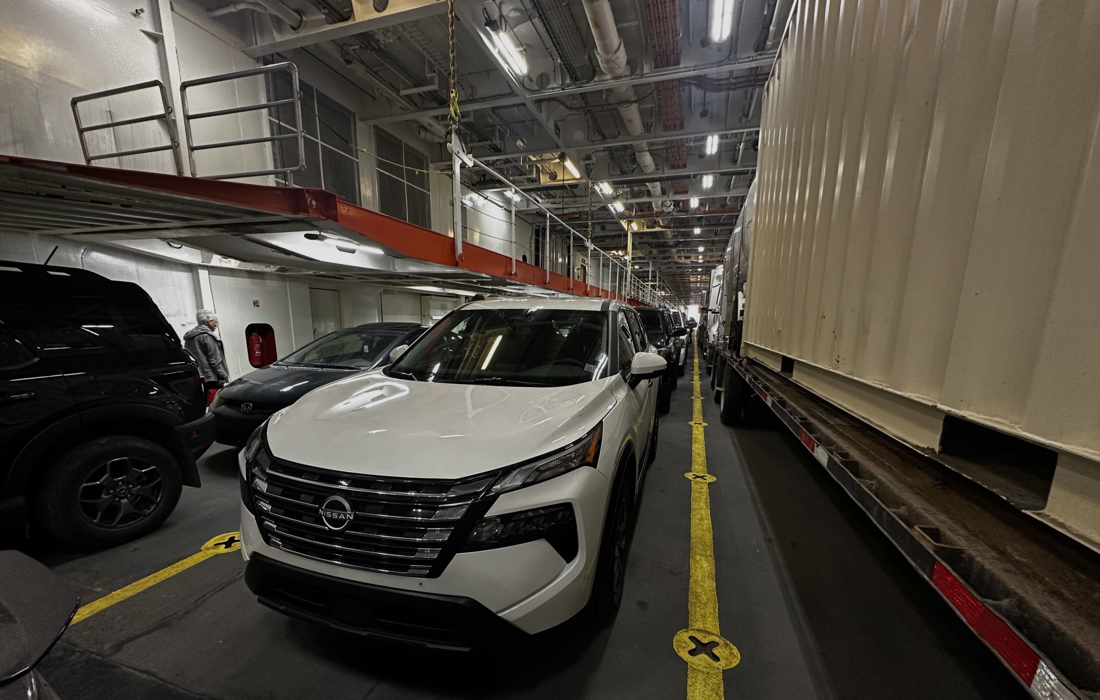Um 10:46 Uhr waren alle ankommenden Fahrzeuge weggefahren und die Beladung unserer Fähre begann mit den grossen LKW. Der Typ vor mir pennte ziemlich und der Einweiser musste ihm zweimal an die Scheibe klopfen, bevor er wach wurde und losfuhr.