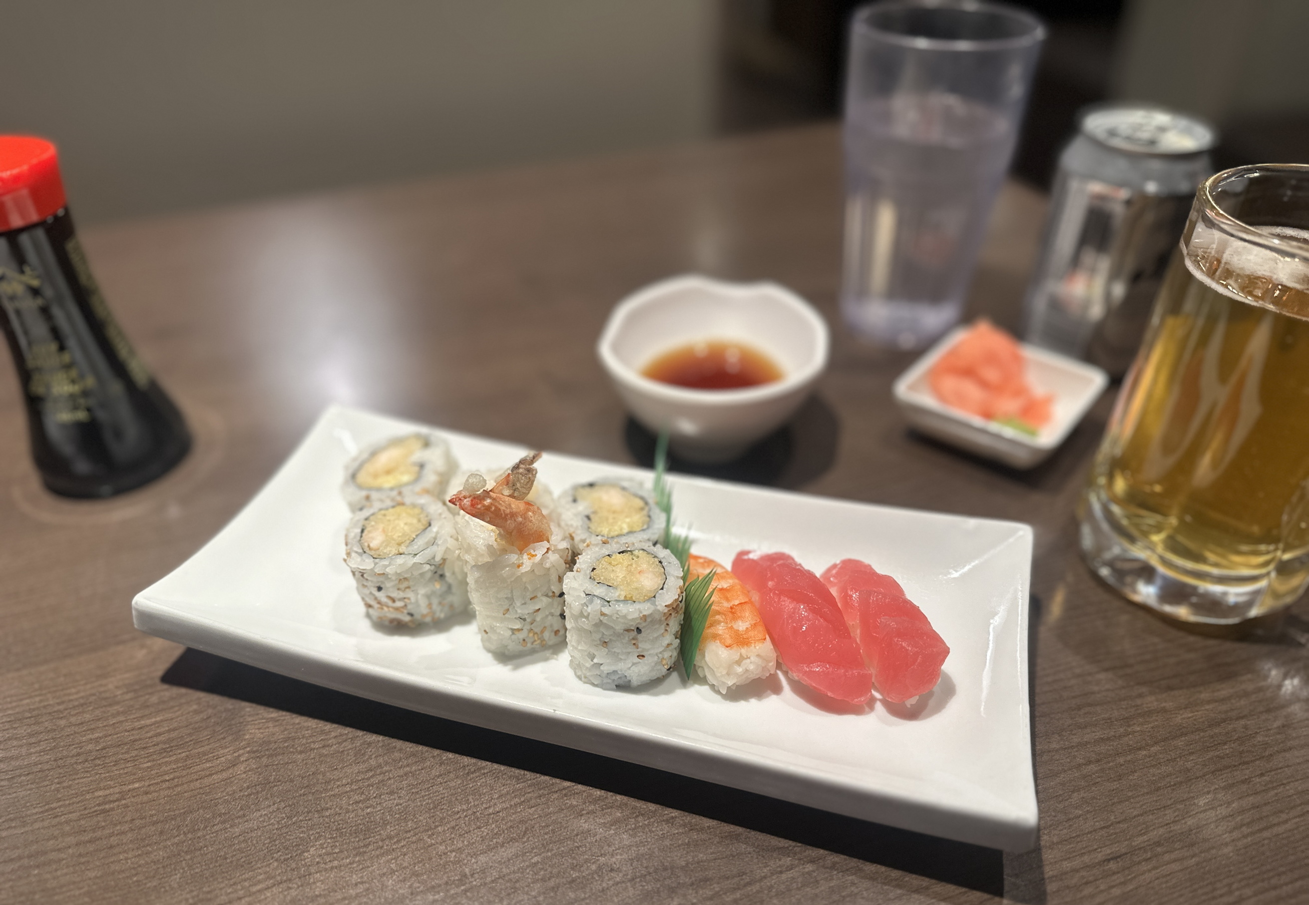 Das Nachtessen genoss ich gleich neben dem Hotel im «Sushi Village». Eigentlich wollte ich mit ein paar Gyoza starten, orderte aber fälschlicherweise eine Wonton-Suppe, danach ein paar Ngiri und Maki Sushi. Die Suppe wurde umgehend gebracht und war schon ziemlich üppig. Da hätte ich eigentlich gar kein Bier mehr gebraucht für die Flüssigkeit. Und Wonton hatte es auch schon fast für eine ganze Mahlzeit.
