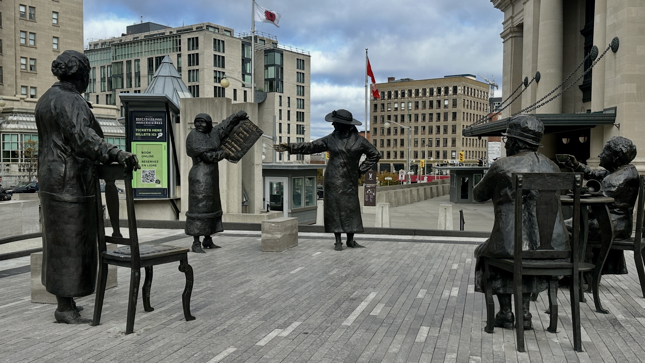 Inzwischen taten mir die Knochen weh wegen der Kälte und dem Wind und so drehte ich um und ging zurück. Unterweg begegneten mir noch diese Frauen hier. Die Skulptur erinnert an Nellie McClung, Henrietta Muir Edwards, Irene Parlby, Louise McKinney und Emily Murphy aus Alberta. Diese «Famous Five» hatten einen Entscheid des höchsten Gerichtshofs Kanadas (Supreme Court) im Jahr 1928, dass Frauen eben keine Personen seien und deshalb nicht in den Senat gewählt werden können, erfolgreich an das oberste Appellationsgericht des Commonwealth gebracht.
