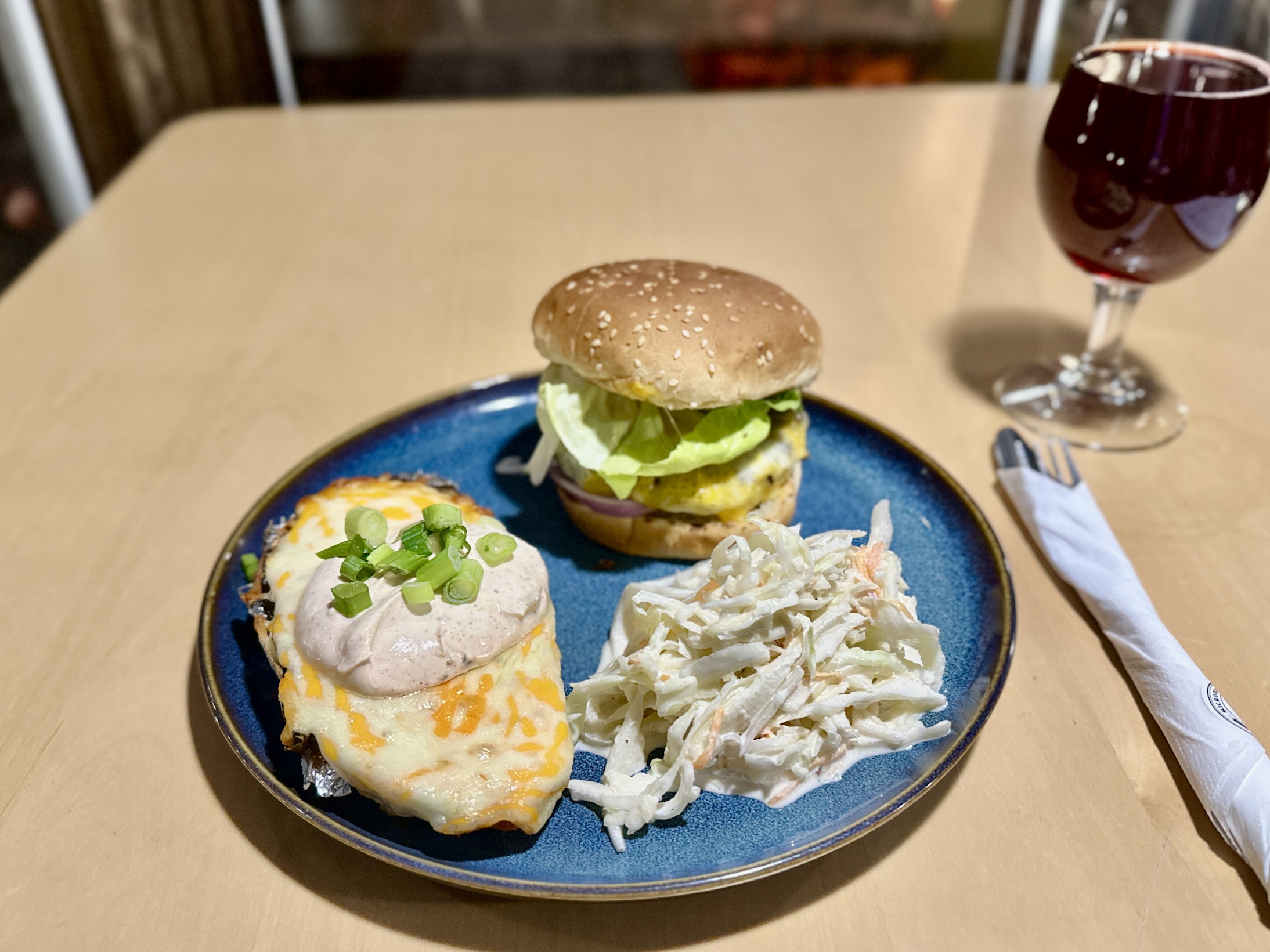Aber hey, es war ja schon nach 17 Uhr und dann hat das Pub zwei Häuser weiter oben, das zur Microbrasserie gehört, geöffnet. Leider gab es immer noch kein IPA, auch nicht in der Dose, wie die Bedienung nach Rückfrage bei der Bar mitteilte. Ich begnügte mich mit der bekannten Auswahl und bestellte dann einen Burger mit Cole Slaw und einer «Kartoffelbeilage», diese stellte sich dann als eine Art «Baked Potatoe» dar.