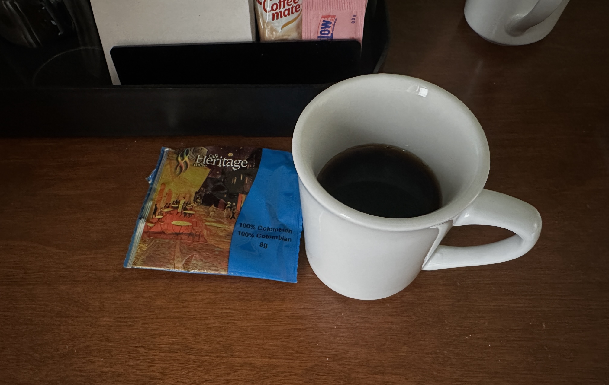 Ich machte mir nur einen Kaffee mit der Maschine im Zimmer (diesmal keine Keurig), welche einigermassen akzeptablen Stoff produzierte.