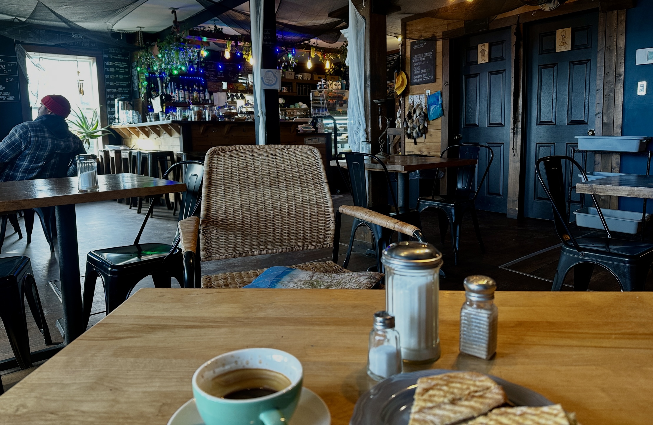 Die Autobahn ist relativ abwechslungsreich, es geht immer mal ein wenig in die Kurven und hoch und runter. Man sieht Flüsse, Seen und zwischendurch auch das Meer. Nach kurzer Zeit fuhr ich in Les Escoumins ab und landete im Café Kiboikoi, wo es einen sehr köstlichen Espresso gab, welcher gut zum aufgewärmten Sandwich passte.