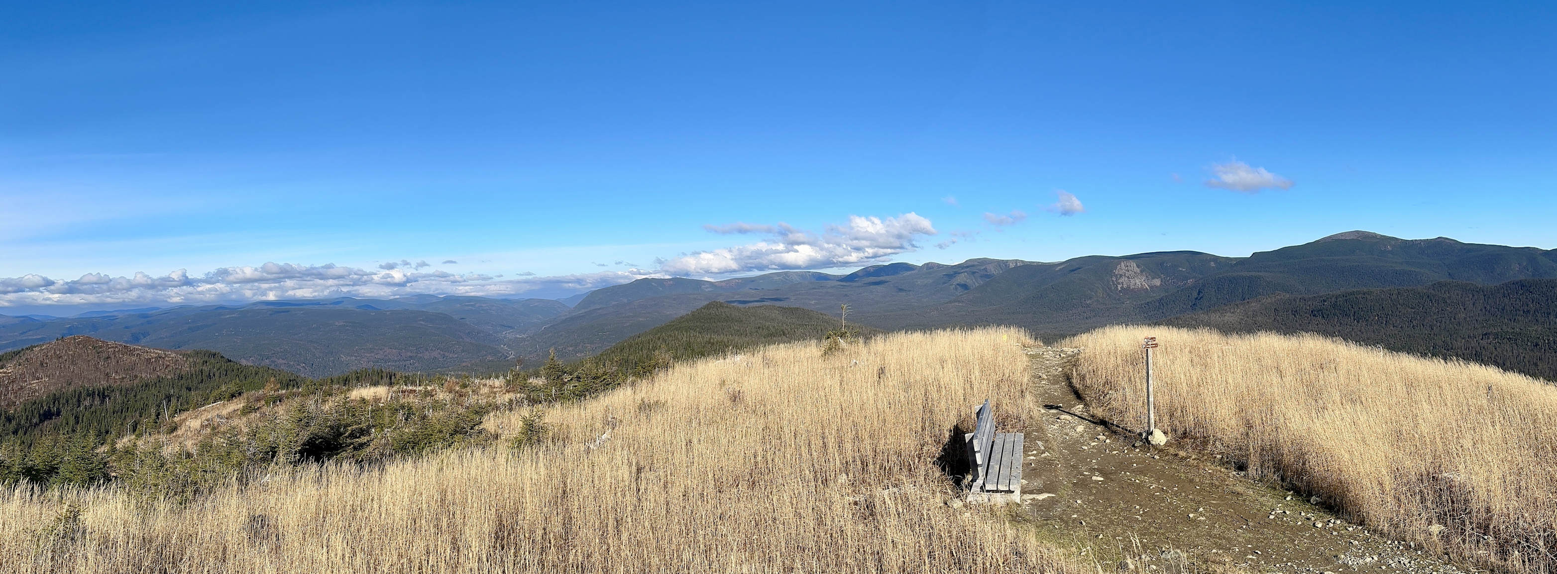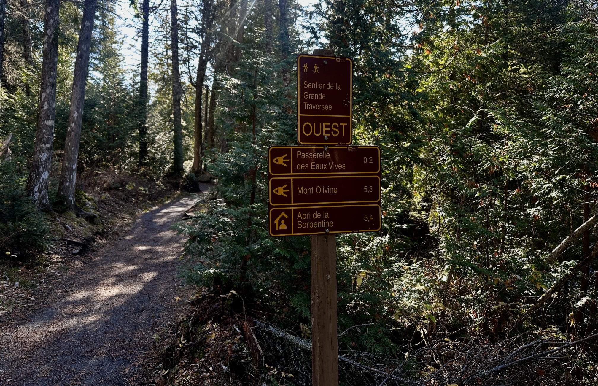 Er erklärte mir, dass es in diesen Wäldern viele Elche gäbe und er hoffe, einen zu sehen. Er meinte dann, wenn ich Zeit hätte, könnte er mir einen schönen Ort zeigen und ja, ich hatte ja Zeit. Also gingen wir zurück zum Parkplatz und fuhren dann nach rund vierhundert Metern links weg in die Wälder auf einer gut befahrbaren Naturstrasse rund neuneinhalb Kilometer zu einem Parkplatz, von wo man einen Fussweg zum Aussichtspunkt des Mont Ernest-Laforce gehen kann.