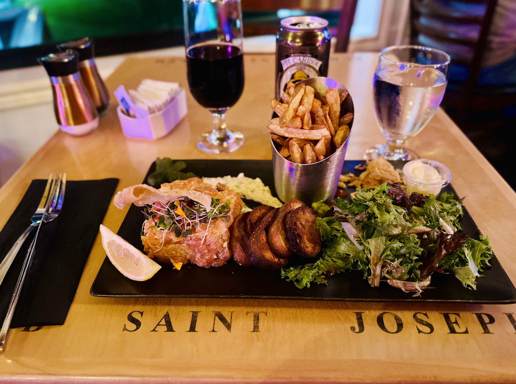 Ich ging aber erst ins im Hotel gelegene Pub Saint-Joseph (der Name hätte meinem Paps selig gefallen) und genoss dort im leicht zu kühlen und leicht zu dunklen Raum eine Tagessuppe und danach ein Tatar von zweierlei Lachs mit Pommes und Salat. Da es keine gescheiten hellen Biere hatte, gab es halt ein ausgezeichnetes Porter der Microbrasserie Pit Caribou dazu.